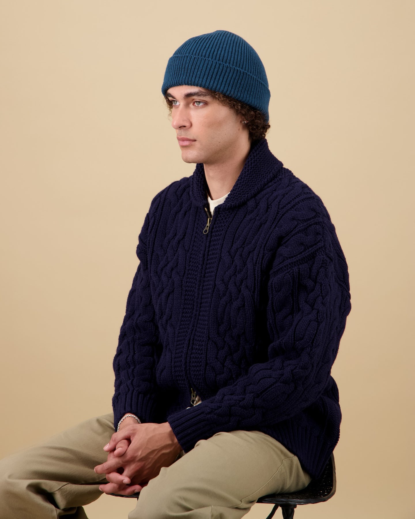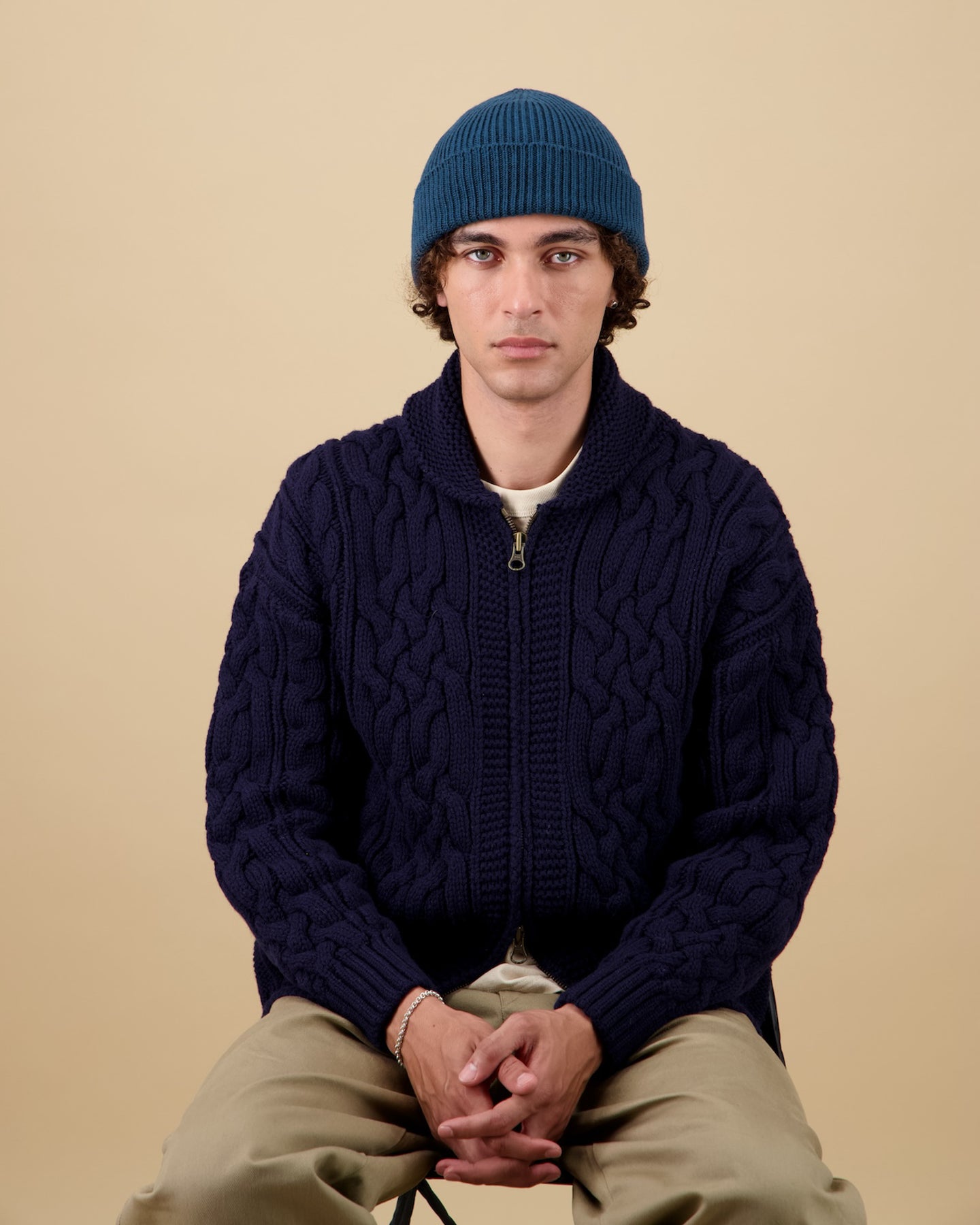 Bonnet Ara bleu pétrole de chez Nitto Knitwear, fabriqué en France dans une laine mérinos extra-fine. Avec sa maille extensible le bonnet Ara épouse parfaitement la forme de la tête sans pour autant comprimer. Tricoté dans une laine mérinos ultra douce et chaude provenant d'Italie avec un fil labélisé Oeko-Tex et RWS.