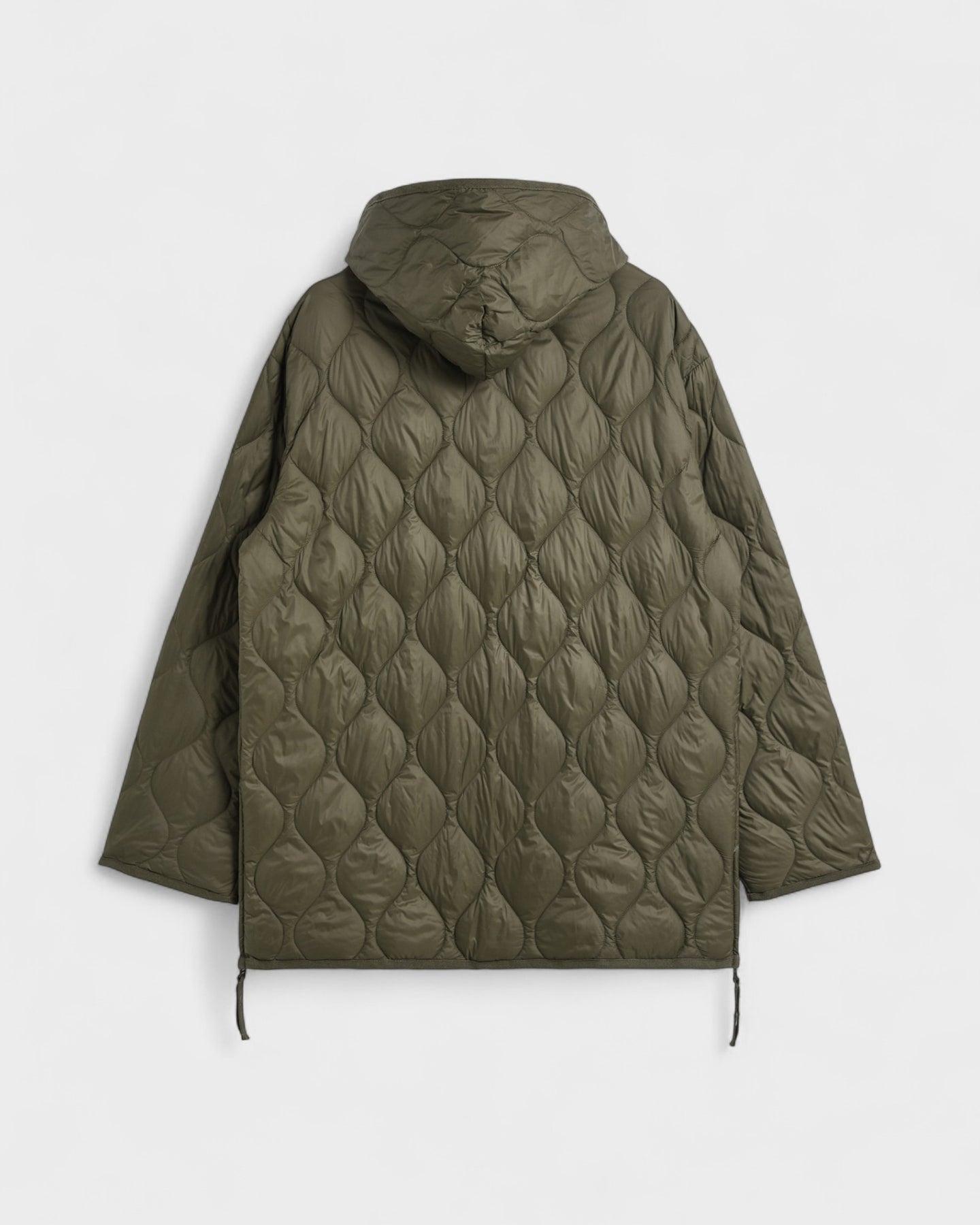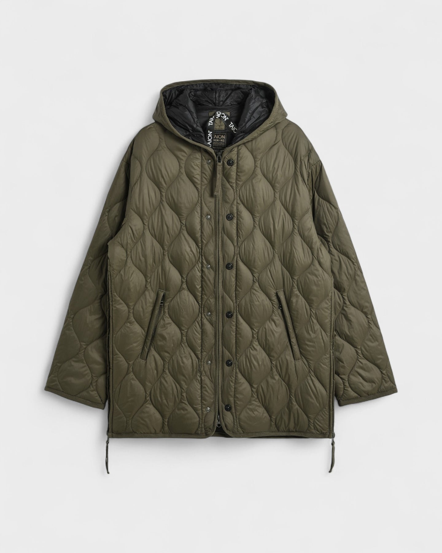 La Military M65 Liner W-Zip Down Jacket de chez TAION fusionne héritage militaire et innovation technique dans une silhouette contemporaine à la coupe légèrement oversize. Confectionnée en soft shell léger et déperlant, elle est isolée avec un duvet de 800 FP, offrant une chaleur optimale tout en restant compressible et légère. Dotée d’une capuche, cette veste assure une protection supplémentaire contre les intempéries. Sa coupe ample permet de superposer facilement des couches, tandis que les fentes latérales zippées offrent une liberté de mouvement accrue. La fermeture à double sens permet d’adapter l’ouverture selon les besoins, et les poches plaquées offrent un rangement pratique.