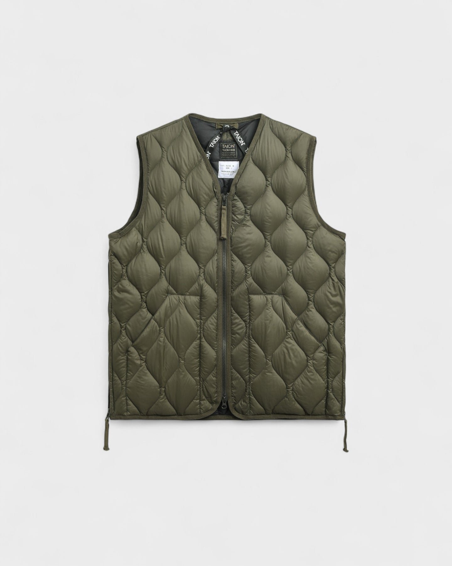 La Military V Neck W-Zip Down Vest de chez Taion est une veste sans manches unisexe qui incarne l’art du layering fonctionnel avec une touche militaire sophistiquée. Confectionnée en soft shell technique, elle est garnie d'un duvet 800 FP de haute qualité offrant une isolation thermique optimisée tout en restant ultra légère. Le col en V et la fermeture W-zip bidirectionnelle assurent une protection adaptable et une ventilation modulable. Ses fentes latérales zippées permettent une grande liberté de mouvement, idéal en superposition ou lors de déplacements actifs. Pensée pour se glisser facilement dans un sac via sa housse de rangement intégrée, cette pièce versatile s’adapte aussi bien à la ville qu’aux excursions imprévues.