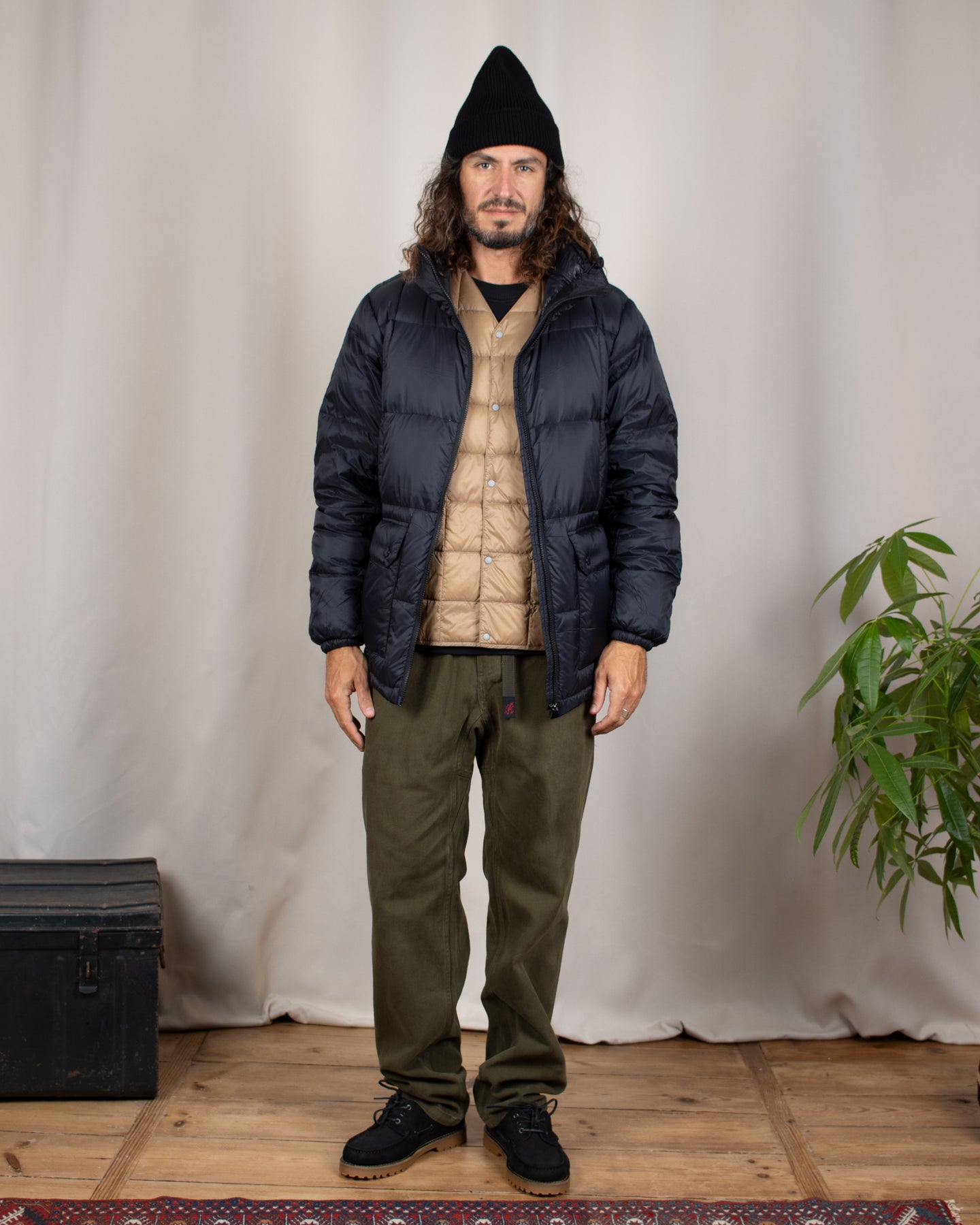 Cette veste taille grand, n'hésite pas à consulter notre guide des tailles. Sur les photos Alexis porte également un bonnet Nitto Knitwear, une veste sans manches Taion, un pantalon Gramicci et des chaussures Garment Project.