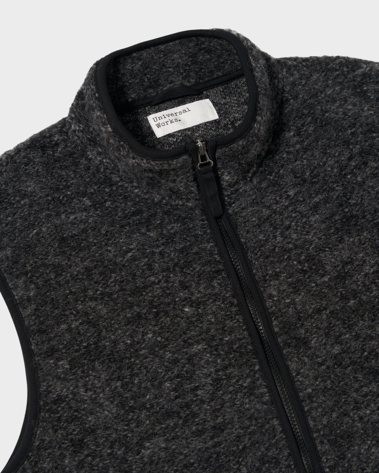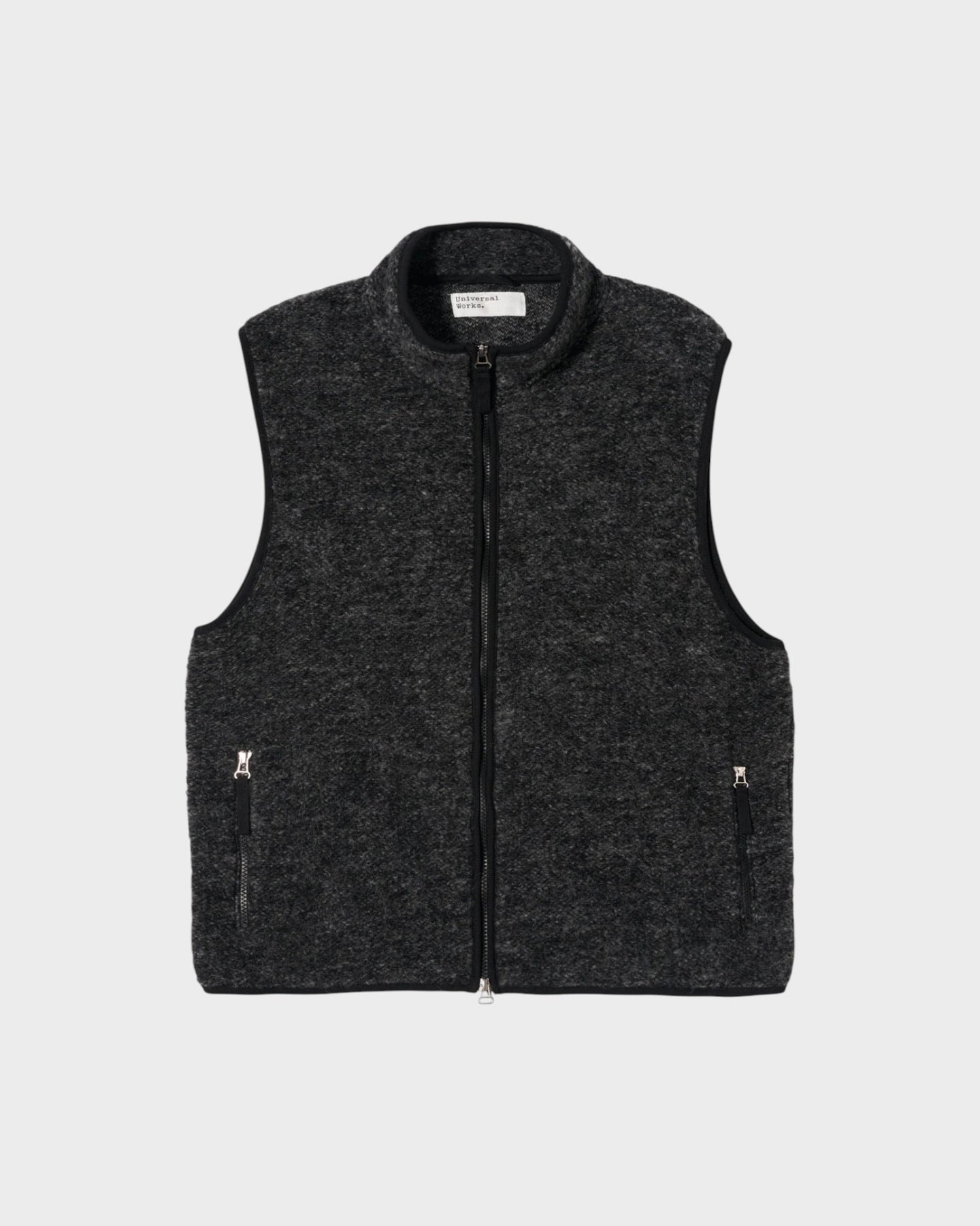 La Climbing Gilet de chez Universal Works est la version sans manches de la veste zippée "Climbing Jacket" en mélange de laine polaire avec un design inspiré d'une veste d'escalade. Un gilet fonctionnel et confortable dotée d'une fermeture à glissière double sens, de deux poches zippées pour les mains, d'ourlets en jersey et d'un col légèrement montant.