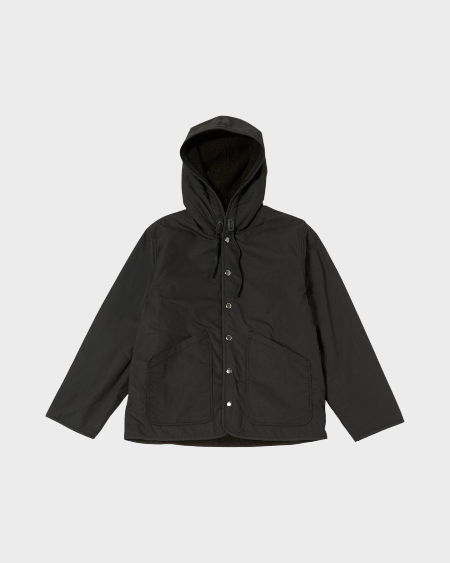 La Reversible Simple Hooded Jacket de chez Universal Works est une veste courte à la coupe ample qui est totalement réversible afin d'être portée des deux côtés selon l'envie du moment. Confectionnée en mélange de coton avec un intérieur en polaire recyclée ultra confortable, cette veste est idéale à porter par temps froid. Sa capuche ajustable, ses deux grandes poches plaquées et sa fermeture par boutons pression la rendent également très fonctionnelle.