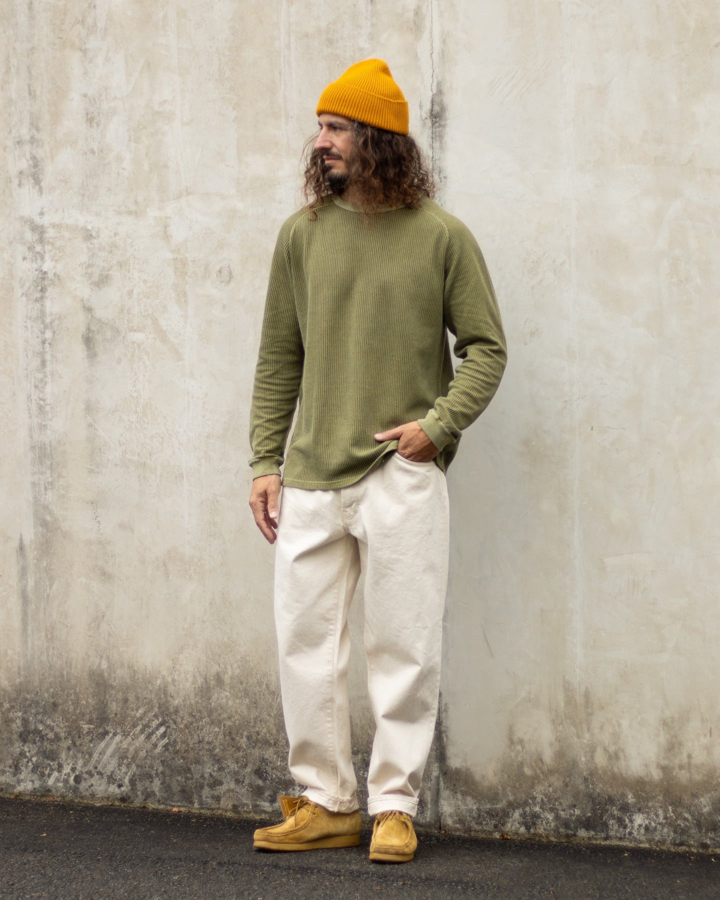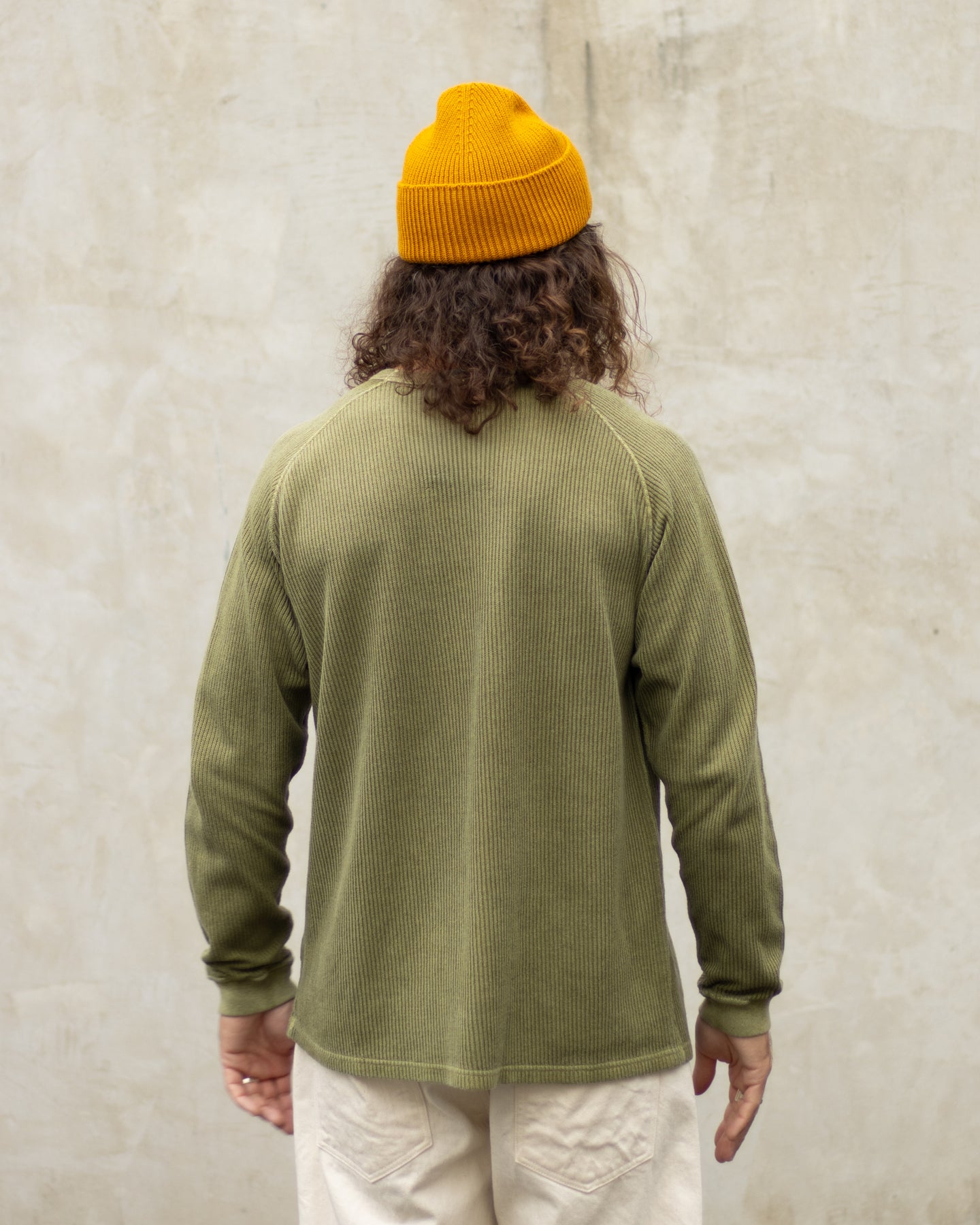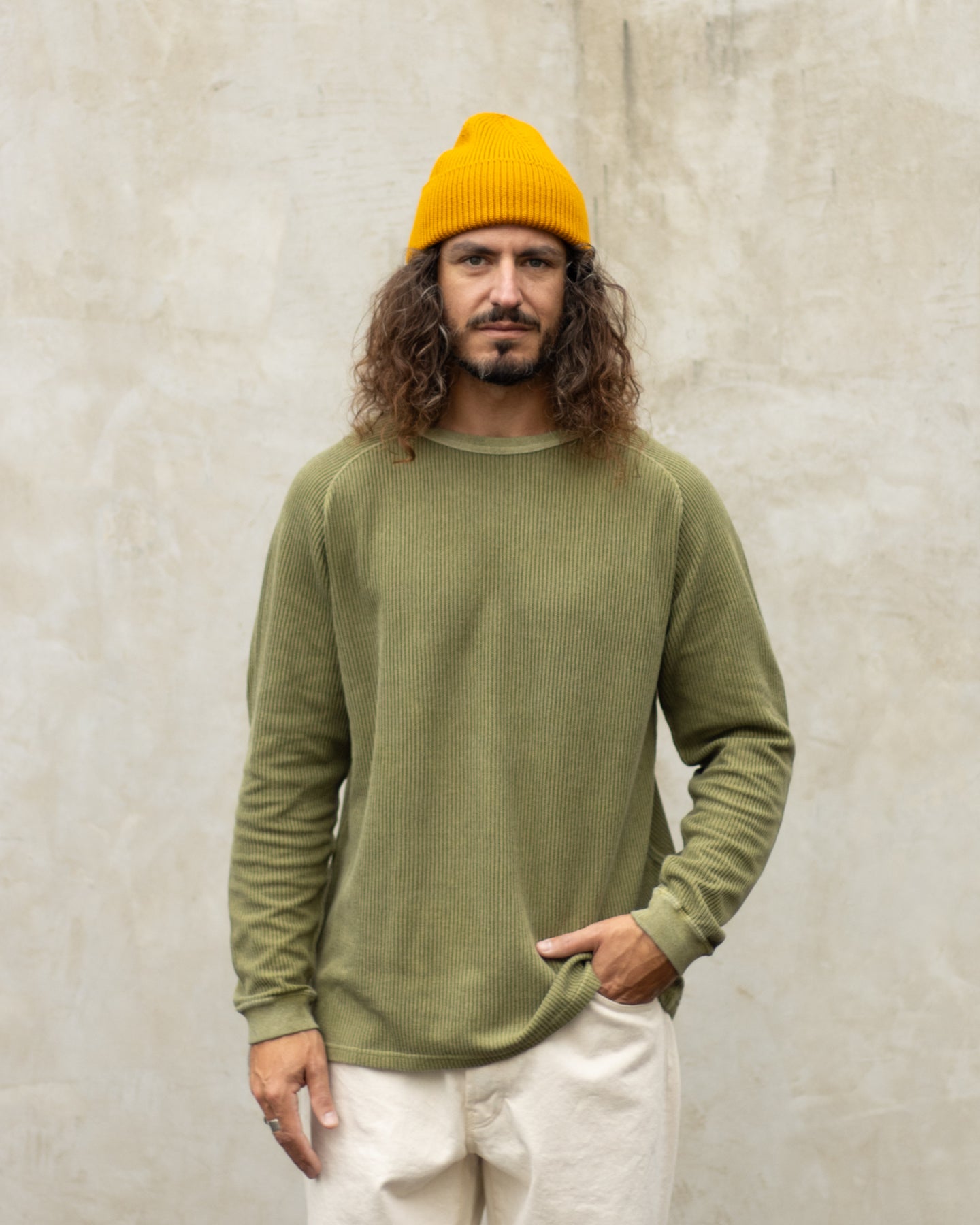 Le Long Sleeve Rib Knit de chez Good On est un tout nouveau design de la marque. Un tee-shirt à manches longues tricoté dans un coton épais texturé ultra doux. Il est doté d'un col rond, de manches raglan pour un plus grand confort et d'une coupe droite décontractée. Il est entièrement fabriqué et teint au Japon en utilisant le procéder de teinture pigmentaire propre à Good On, conférant à chaque pièce une patine unique et un style vintage qui lui permettra de s'embellir avec le temps.
