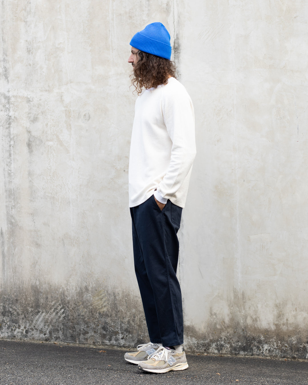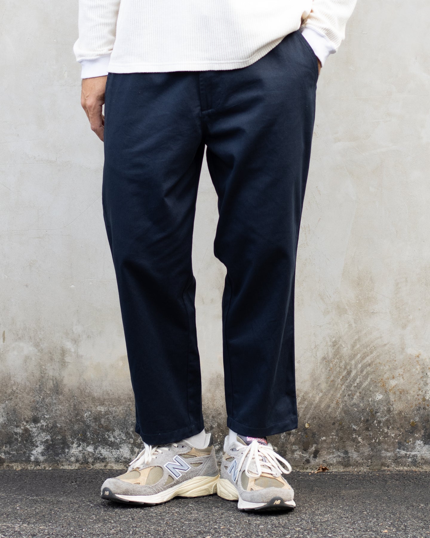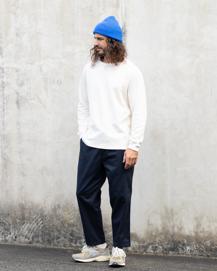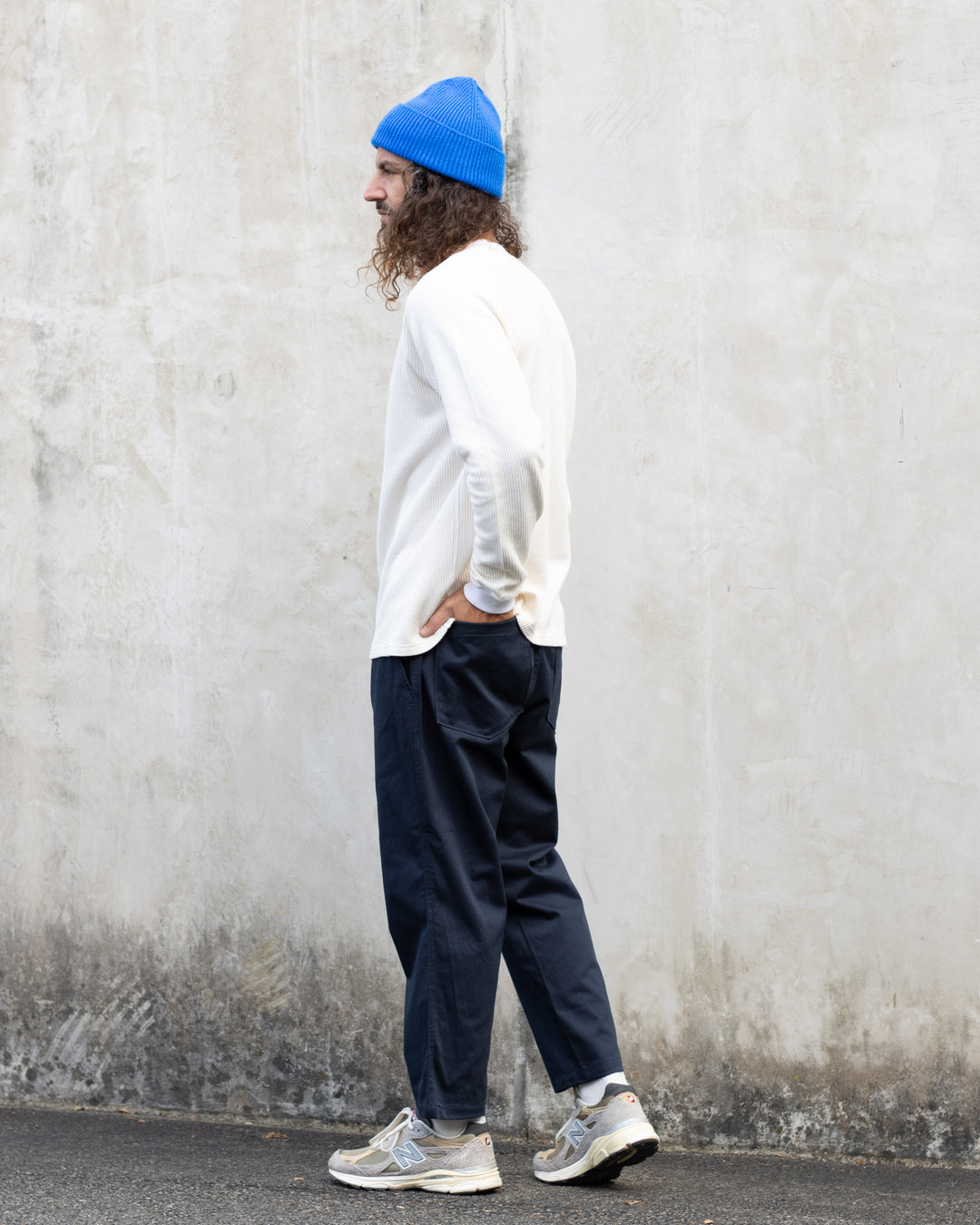 Ce pantalon taille normalement et se porte ample, n'hésite pas à te référer à notre guide des tailles. Sur les photos Alexis porte également une veste Universal Works et un tee-shirt Good On.