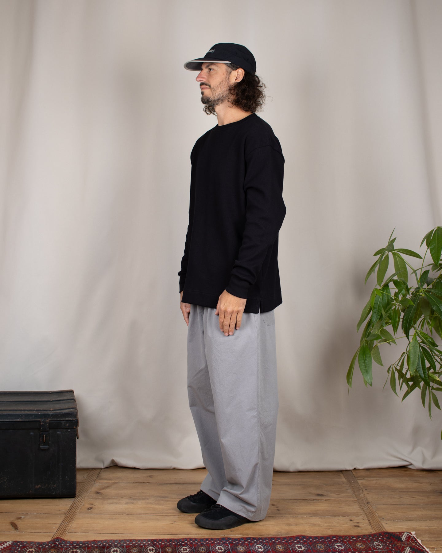 Le tee-shirt Vahé taille normalement et se porte ample, n'hésite pas à te référer à notre guide des tailles. Sur les photos Alexis porte également une casquette Gramicci, une chemise Woodbird et un pantalon Kappy Design.