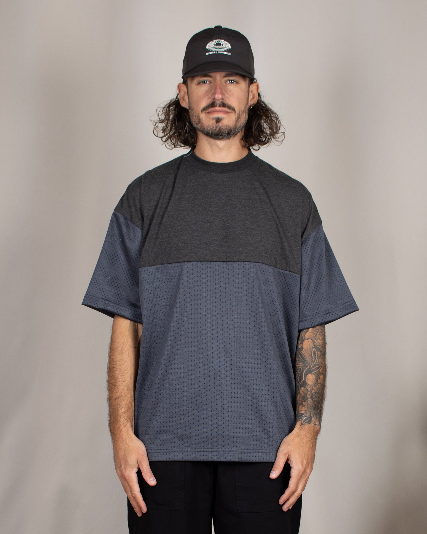 Le Mesh de chez Taion est un tee-shirt technique oversize issu de la ligne Japan Special, qui met l’accent sur des pièces plus expérimentales de la marque japonaise. Inspiré de l'esthétique des maillots de sport, il se distingue par sa construction bi-matière combinant jersey et empiècements en mesh respirant. Cette alternance de textures apporte à la fois ventilation, légèreté et un contraste visuel marqué.