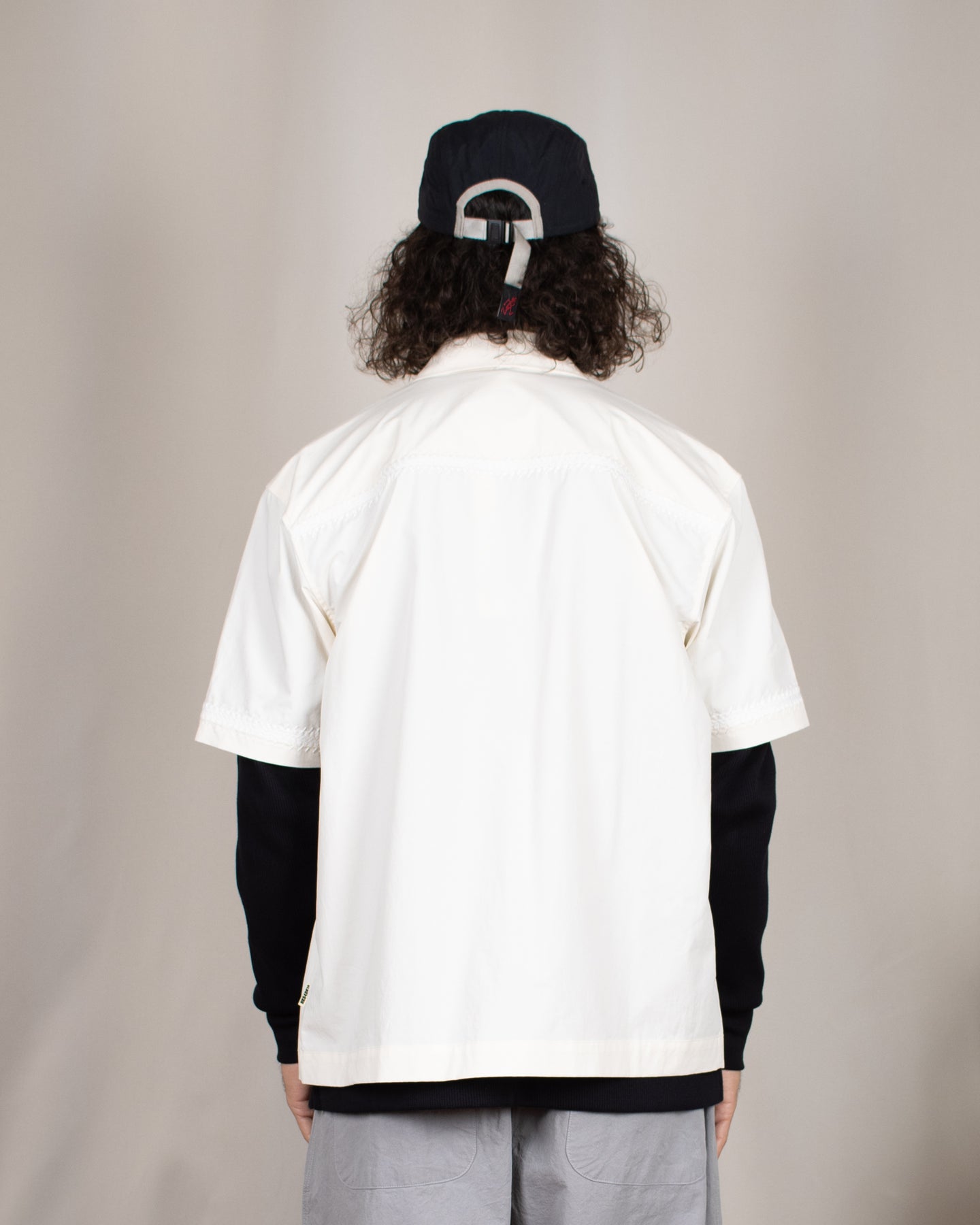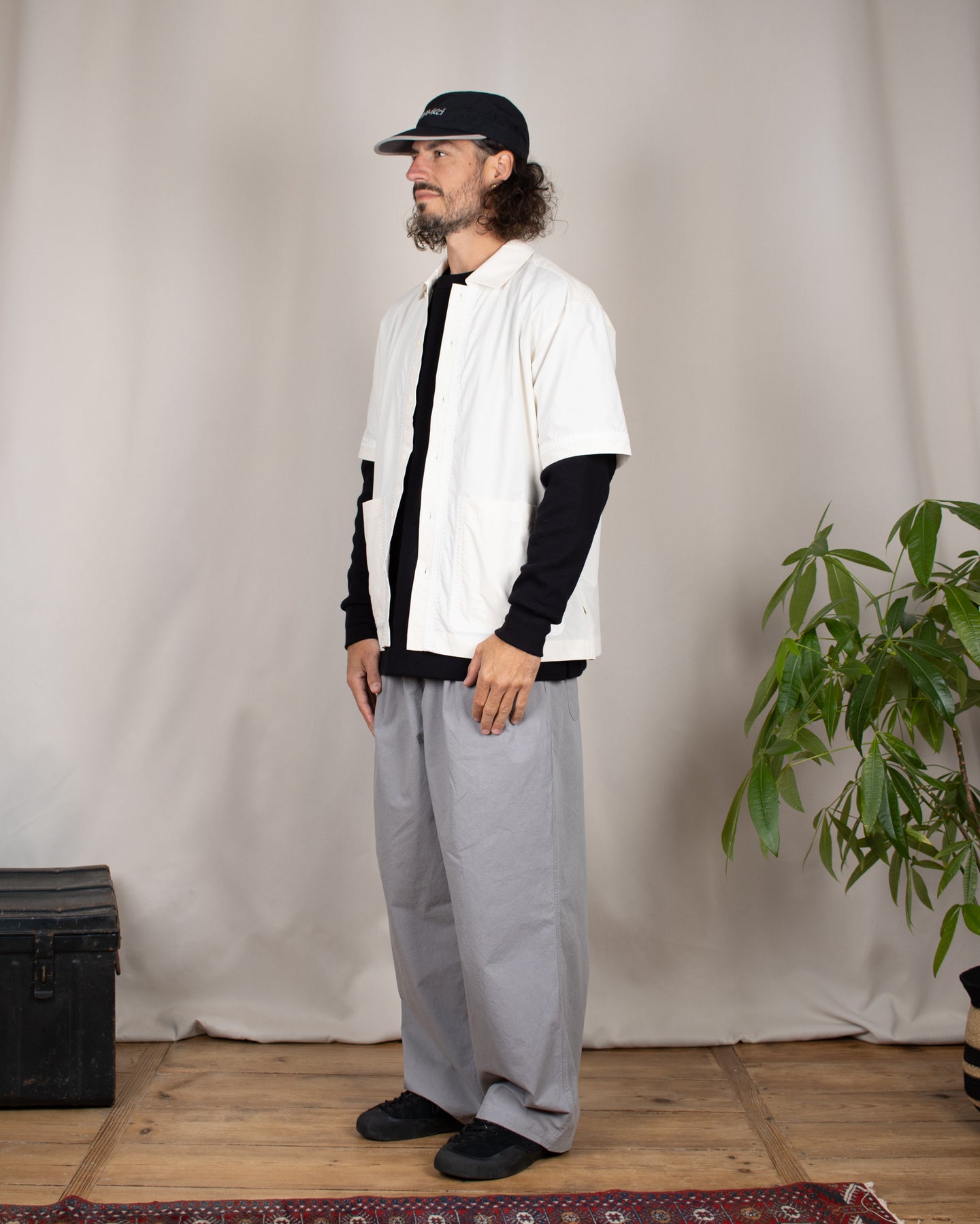 Cette chemise taille grand et se porte ample, n'hésite pas à te référer à notre guide des tailles. Sur les photos Alexis porte également une casquette Gramicci, une veste Woodbird et un pantalon Kappy Design.