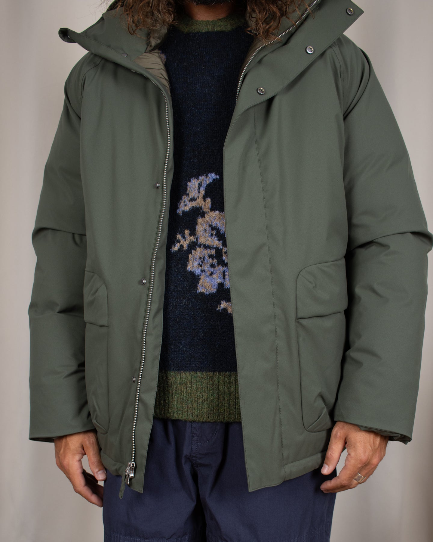 Cette parka taille plutôt grand, n'hésite pas à te référer à notre guide des tailles. Sur les photos Alexis porte également un pull et un pantalon Element Special Projects ainsi que des chaussures Garment Project.