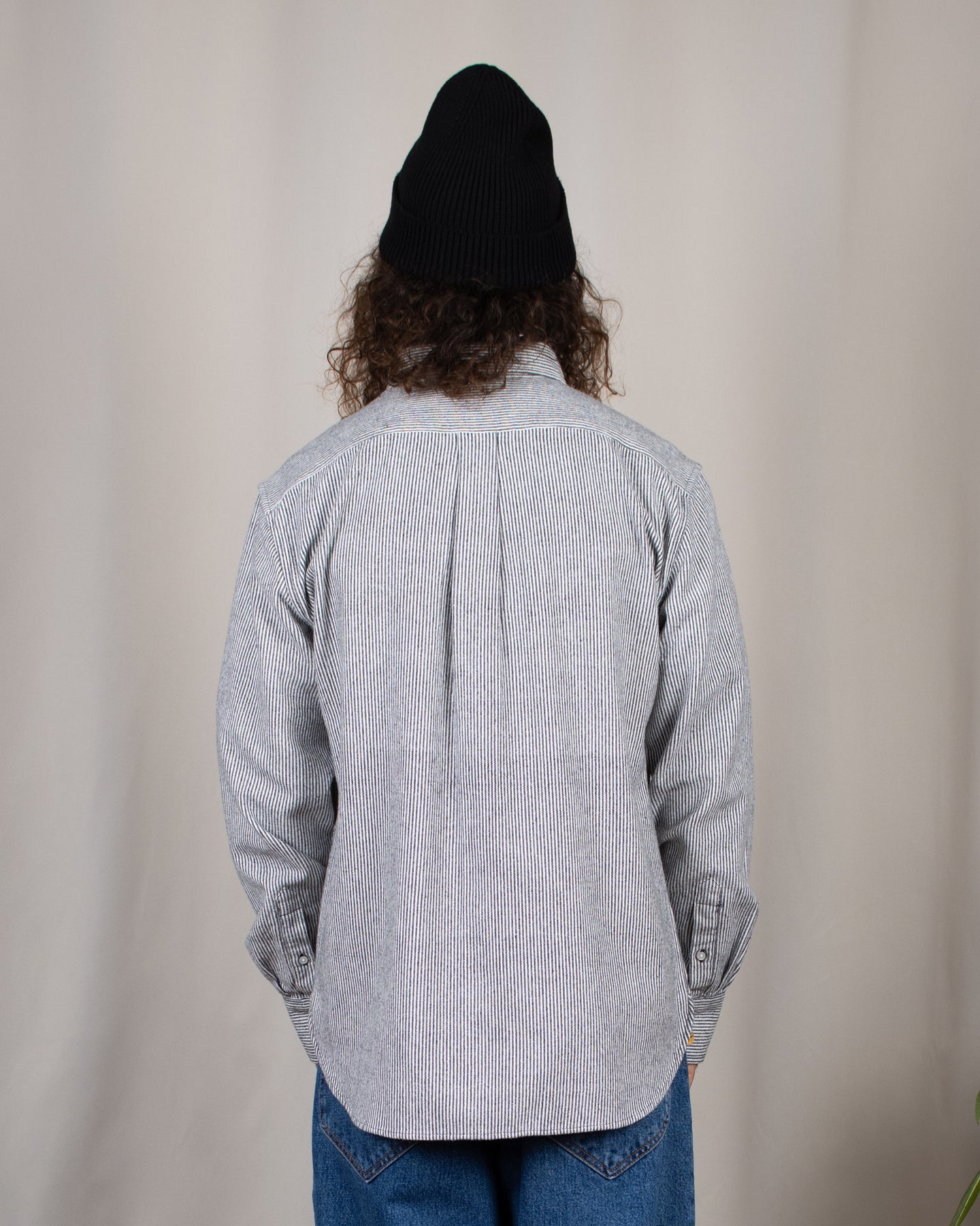 Cette chemise taille normalement, n'hésite pas à te référer à notre guide des tailles. Sur les photos Alexis porte également un bonnet Nitto Knitwear, un gilet sans manches Coldbreaker, un jean Wooden et des chaussures Garment Project.