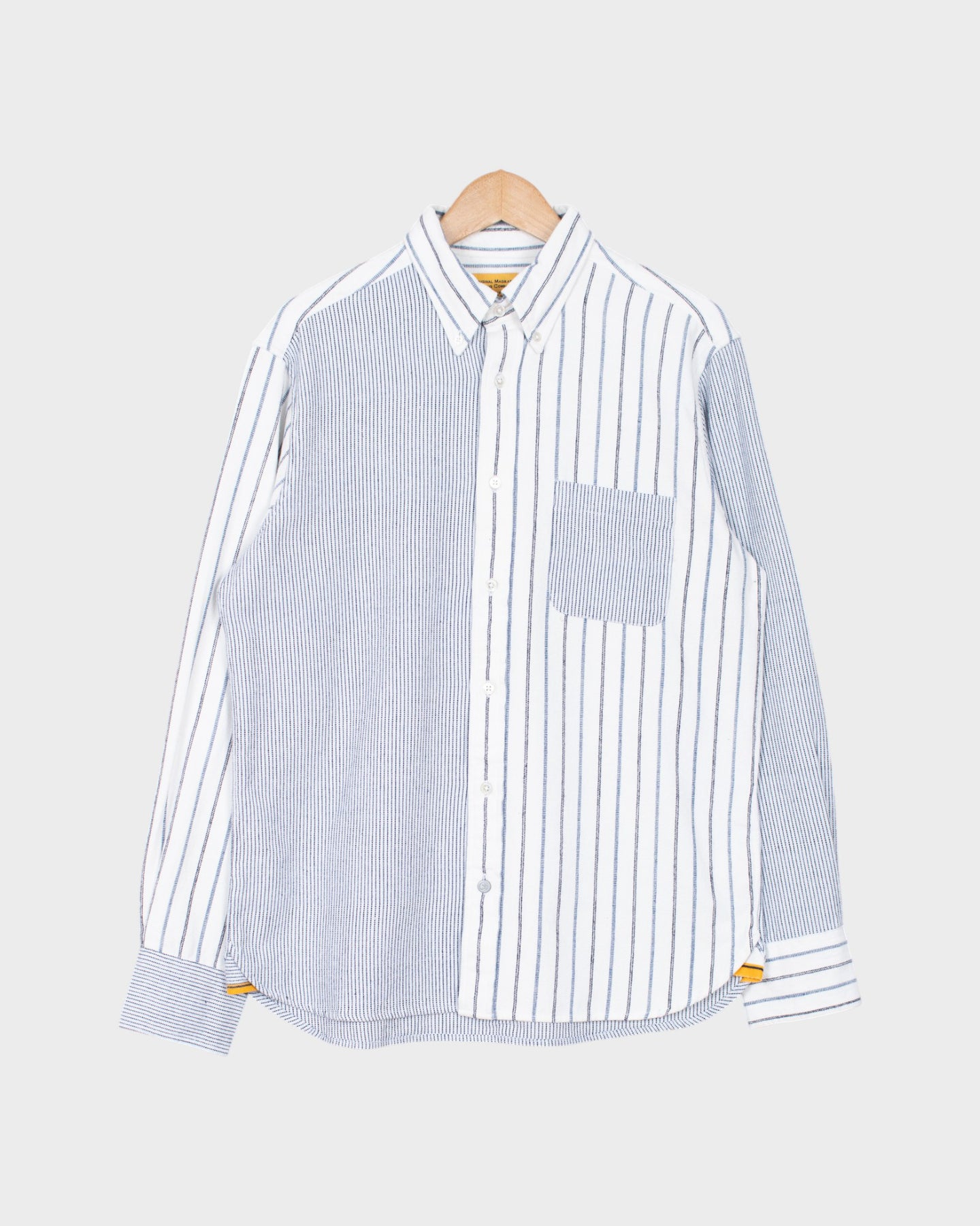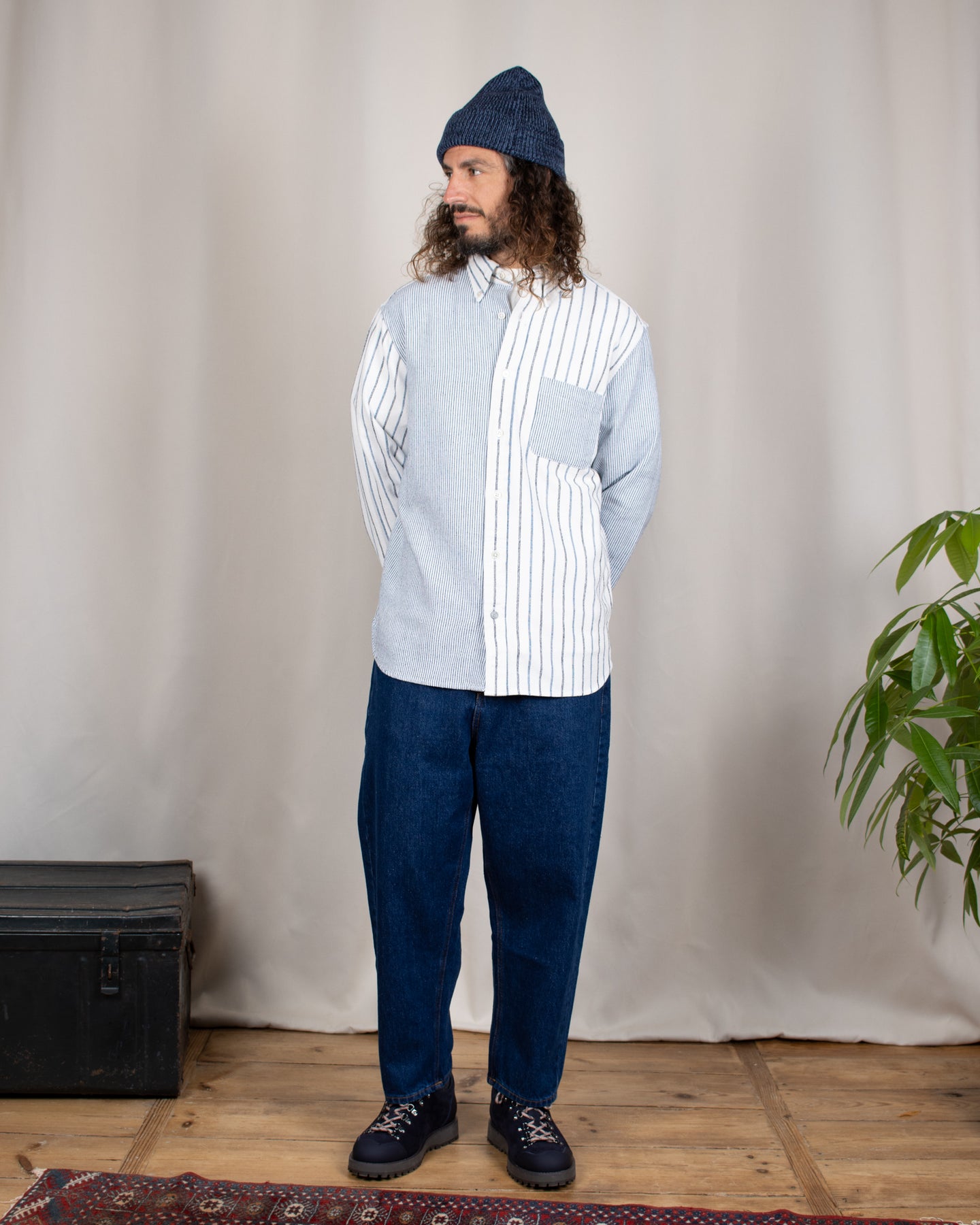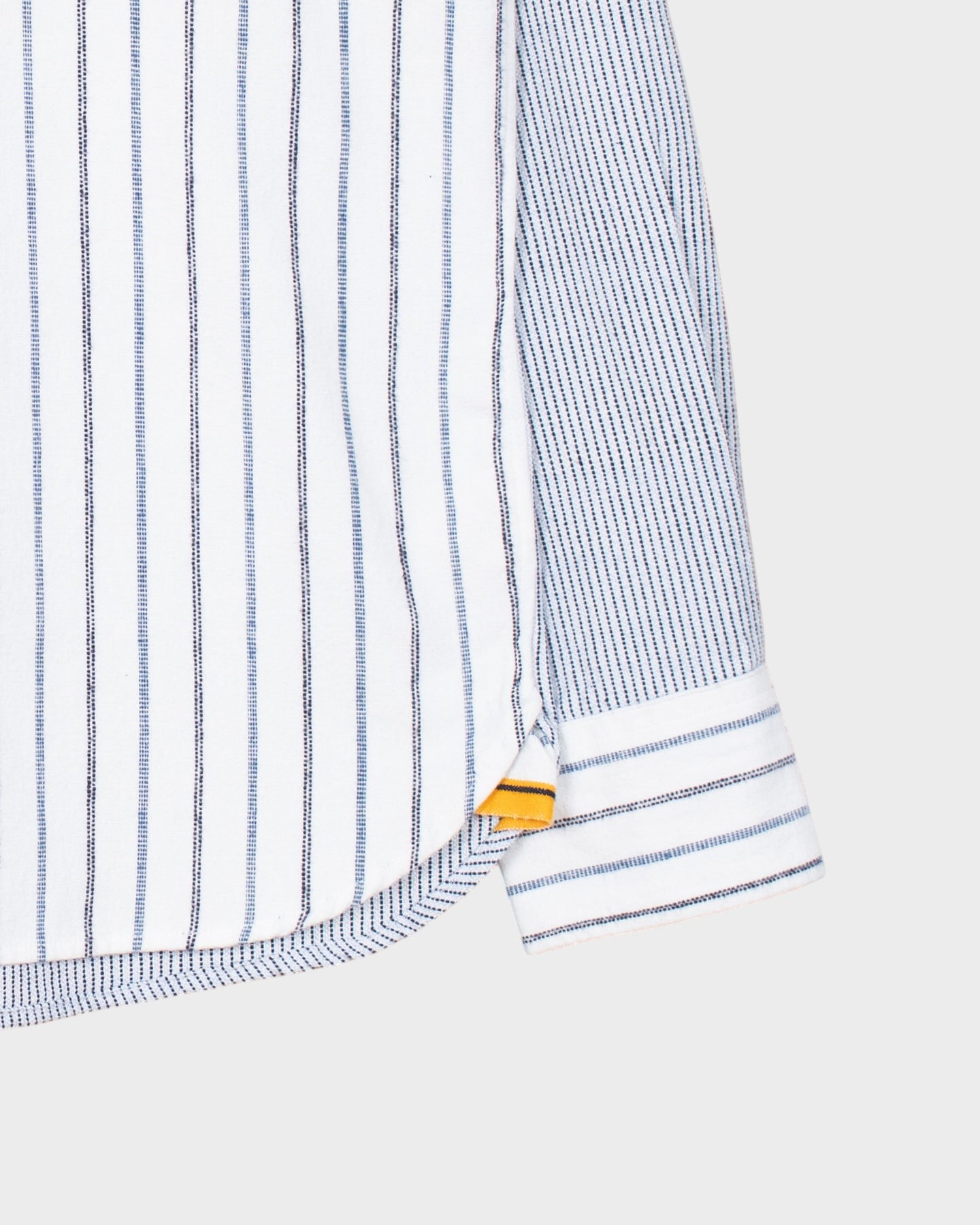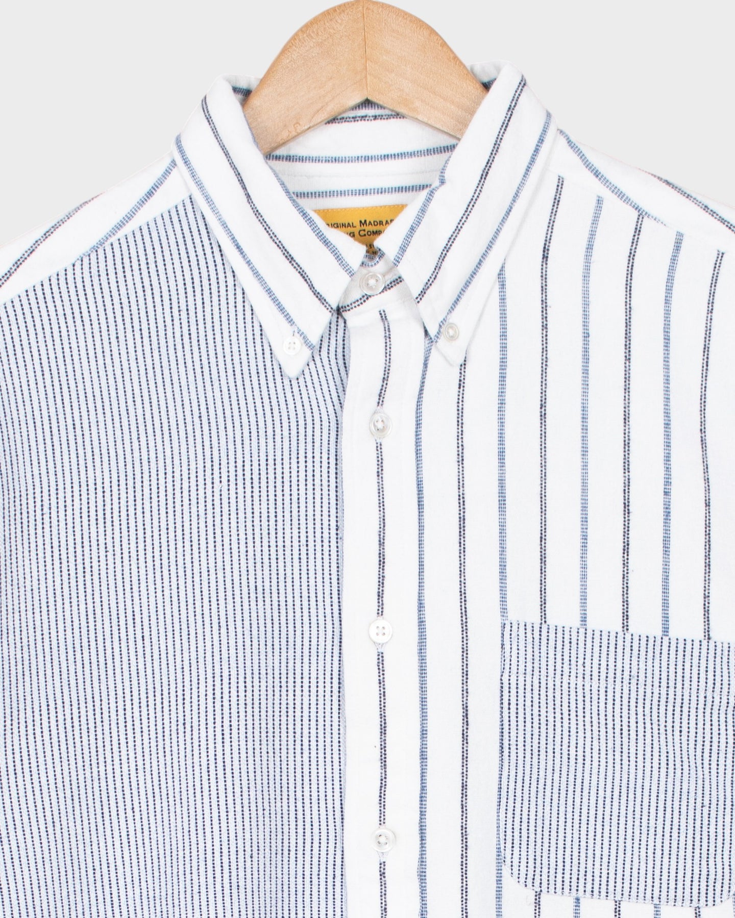 La N°5 Classic Button Down de chez Original Madras est une chemise à manches longues à la coupe droite décontractée avec un col boutonné généreux et une poche poitrine. Dans cette version elle arbore un motif à rayures bleues sur une base blanche. Cette chemise est confectionnée dans un tissu Madras traditionnel de poids moyen, elle est tissée à la main sur des métiers à tisser exclusifs dans les ateliers de la marque en Inde.