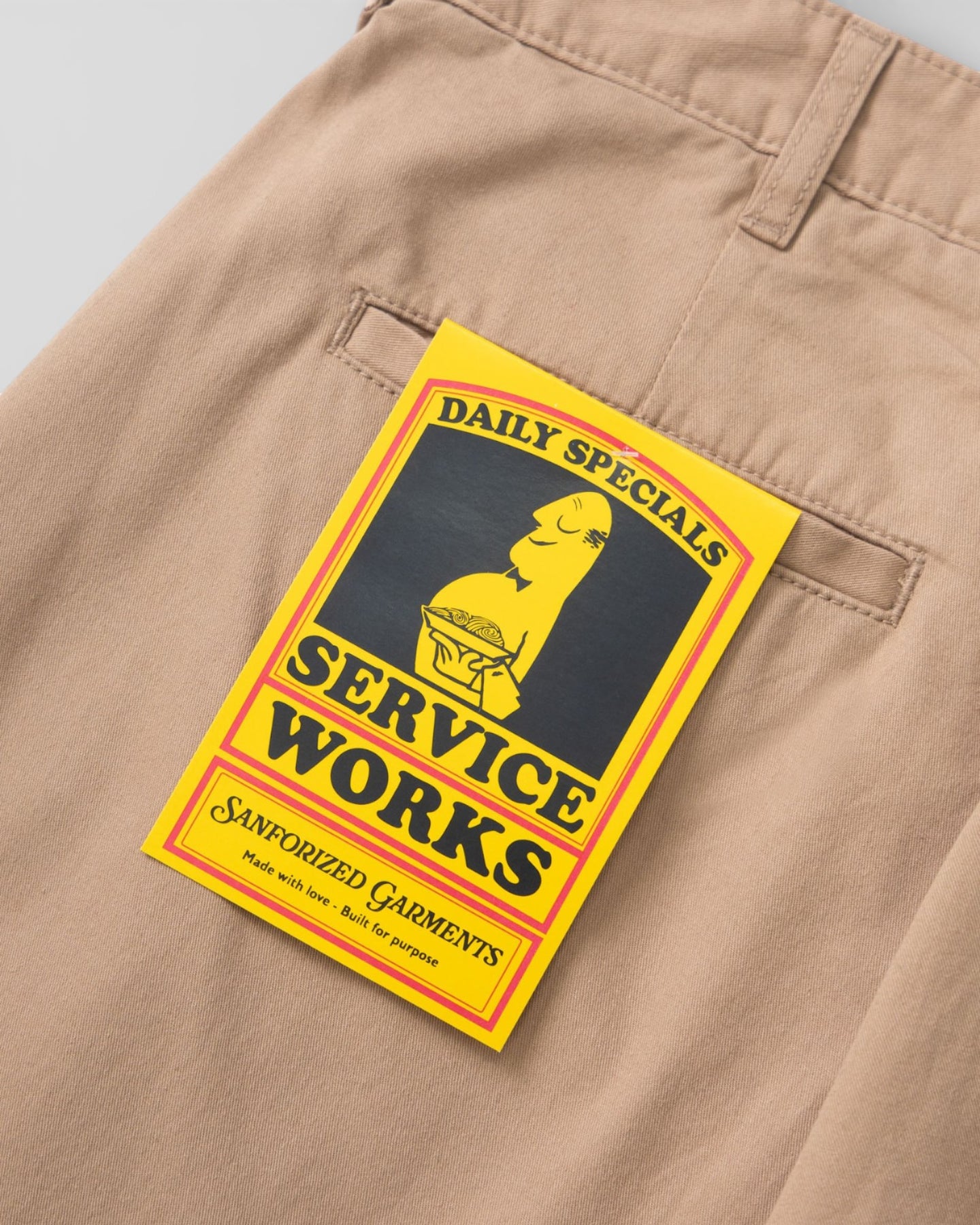 Le Twill Part Timer Pant de chez Service Works est un pantalon inspiré du workwear, pensé pour offrir une silhouette ample et confortable au quotidien. Confectionné en twill de coton biologique certifié GOTS d’un grammage de 250 g/m², il associe robustesse et légèreté. Sa construction à double pli sur le devant lui donne du volume et structure une coupe baggy de type « balloon » avec un léger resserrement vers le bas de jambe. Teint en pièce pour obtenir une couleur olive profonde, il développera un aspect unique au fil du temps. Doté d’une braguette zippée avec fermeture boutonnée, de passants de ceinture et de poches arrière avec étiquette tissée, ce pantalon combine fonctionnalité et esthétique utilitaire.