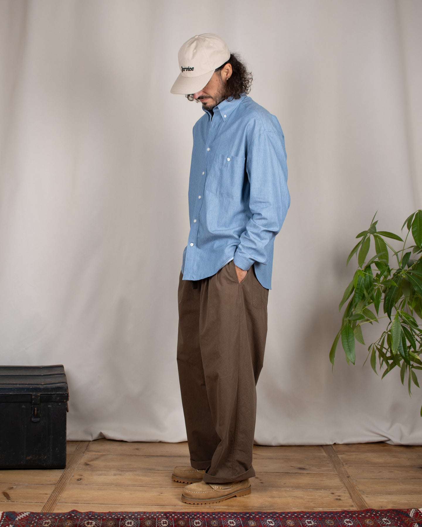 Cette chemise taille grand et se porte ample, n'hésite pas à te référer à notre guide des tailles. Sur les photos Alexis porte également une casquette Service Works, une veste Universal Works, un pantalon Kappy Design et des chaussures Garment Project.