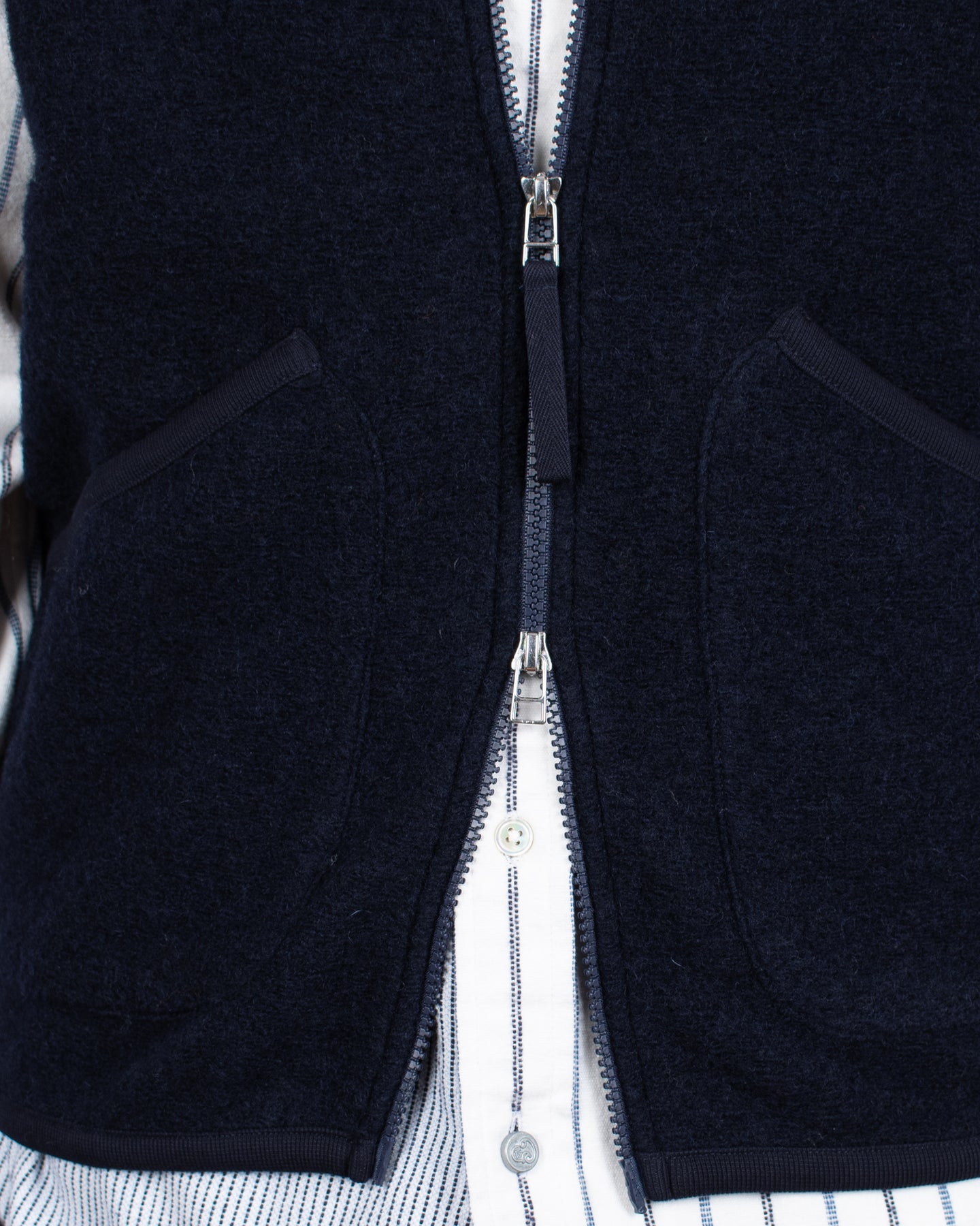 Le Zip Waistcoat Wool Fleece de chez Universal Works est un design emblématique de la marque reconduit chaque saison. Un gilet sans manches fonctionnel et confortable, idéal pour faire de la superposition de vêtements par temps froid. Confectionné dans une polaire en mélange de laine, il dispose d'une fermeture à glissière à double sens, de 2 poches plaquées inclinées et d'ourlets en jersey.