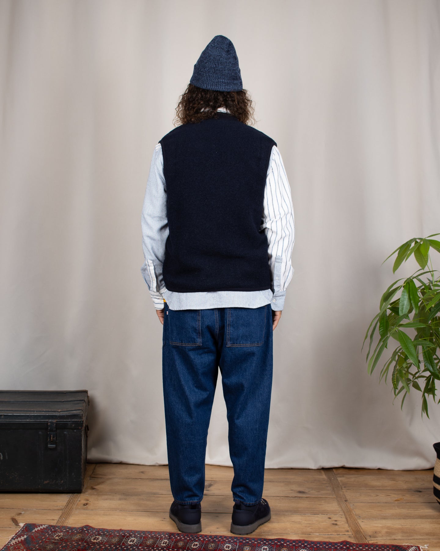 Ce gilet sans manches taille plutôt petit, n'hésite pas à te référer à notre guide des tailles. Sur les photos Alexis porte également un bonnet Nitto Knitwear, une chemise Original Madras, un tee-shirt Regards, un jean Wooden et des chaussures Garment Project.